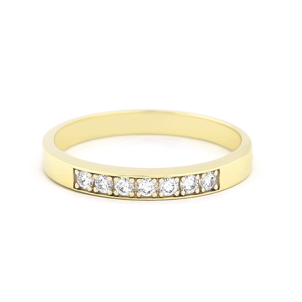 V tradiční kulaté šíně je zasazeno sedm kusů drahých kamenů s kulatým briliantovým brusem o průměru 1,8 milimetru a celkové hmotnosti 0,165 karátu. Naše česká firma OPTIMA DIAMANT standardně nabízí kvalitní kameny s ověřenou čistotou i barvou. V tomto případě diamanty nevystupují z obroučky, proto se nezachytávají o oděv a prsten je tak vhodný na každodenní nošení.