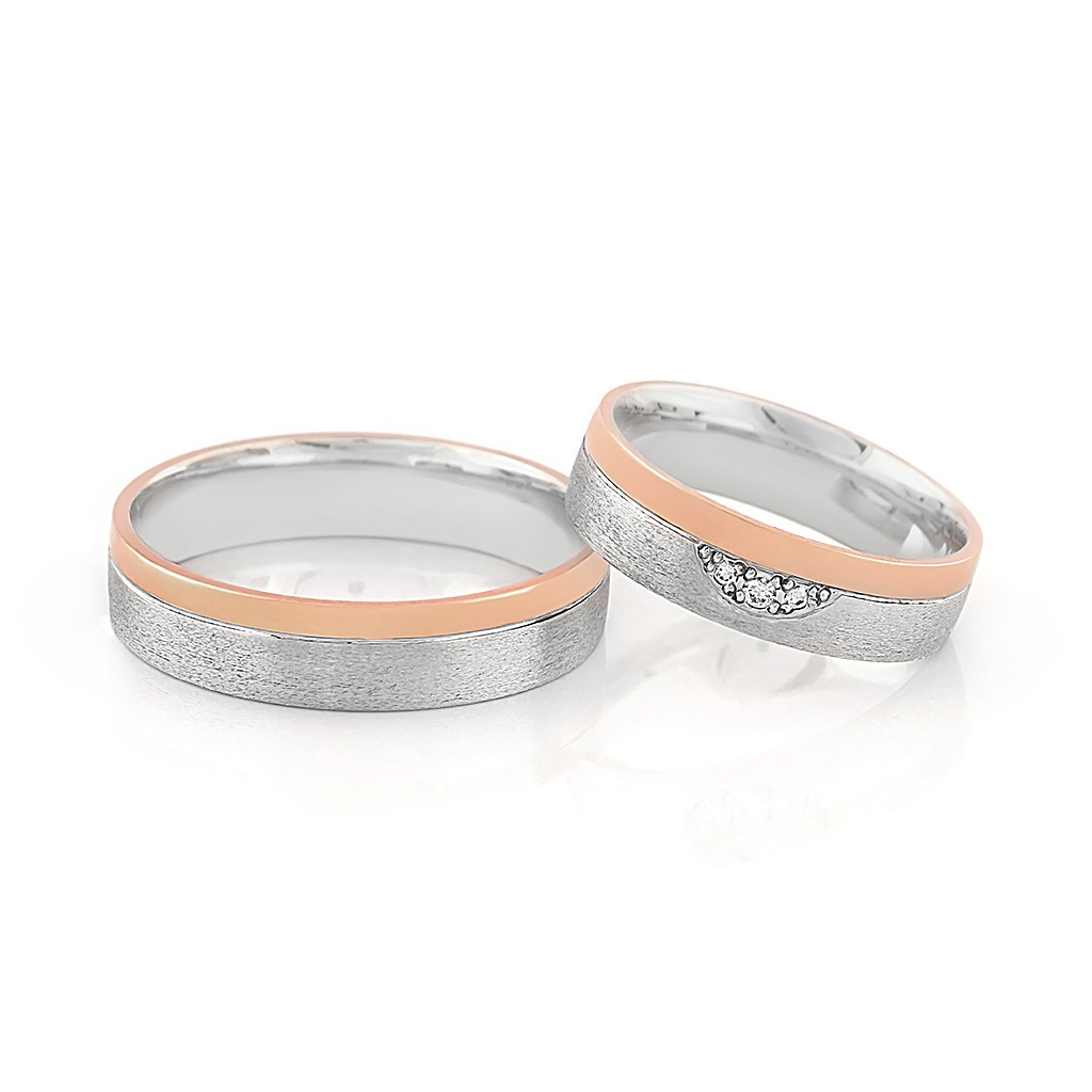 Pokud hledáte exkluzivní, moderní snubní prsteny, pak vás může zaujmout svěží design těchto šperků vycházející z kontrastu bílého a červeného zlata. Zatímco dominantní část obroučky z bílého kovu je na povrchu zdrsněná smirkováním, užší část šíny z červeného zlata je naopak vyleštěná do hladka. Dámský prsten korunují tři vzácně bílé diamanty s kulatým briliantovým brusem o průměru 1,15 – 1,55 milimetru. Jsou zafasované tak, že vytvářejí okouzlující jemný ornament.